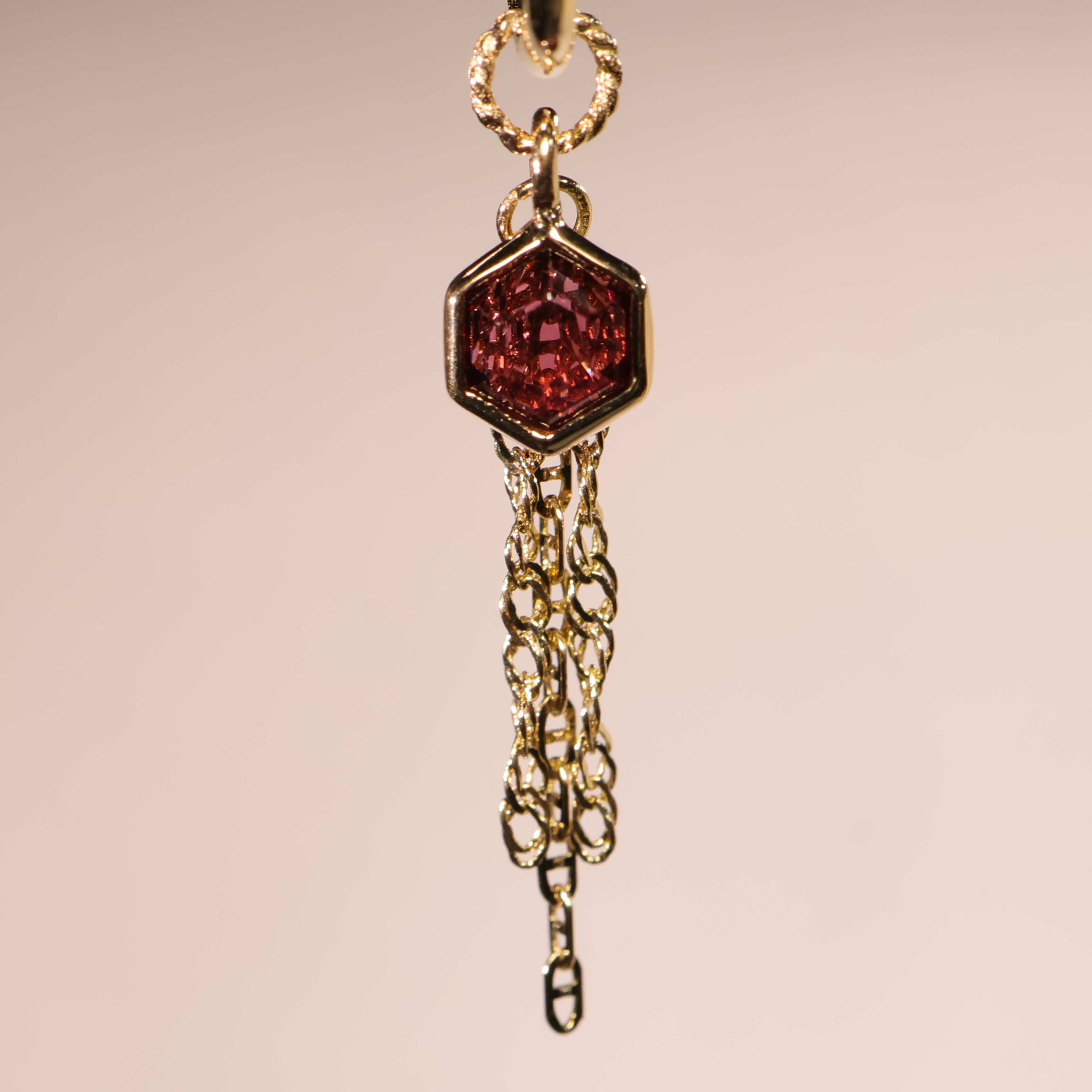 Hexagon Charm with Draped Tassel Chains - Gold / Rhodolite Garnet