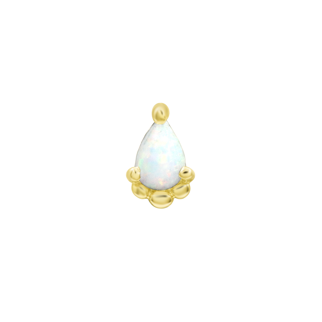 經典的梨形蛋白石寶石飾有珠子以包圍寶石。 Amani 的尺寸為 2.7 x 4.4 毫米,Opal 的尺寸為 3 x 2 毫米。 有黃金、玫瑰金和白金可供選擇。